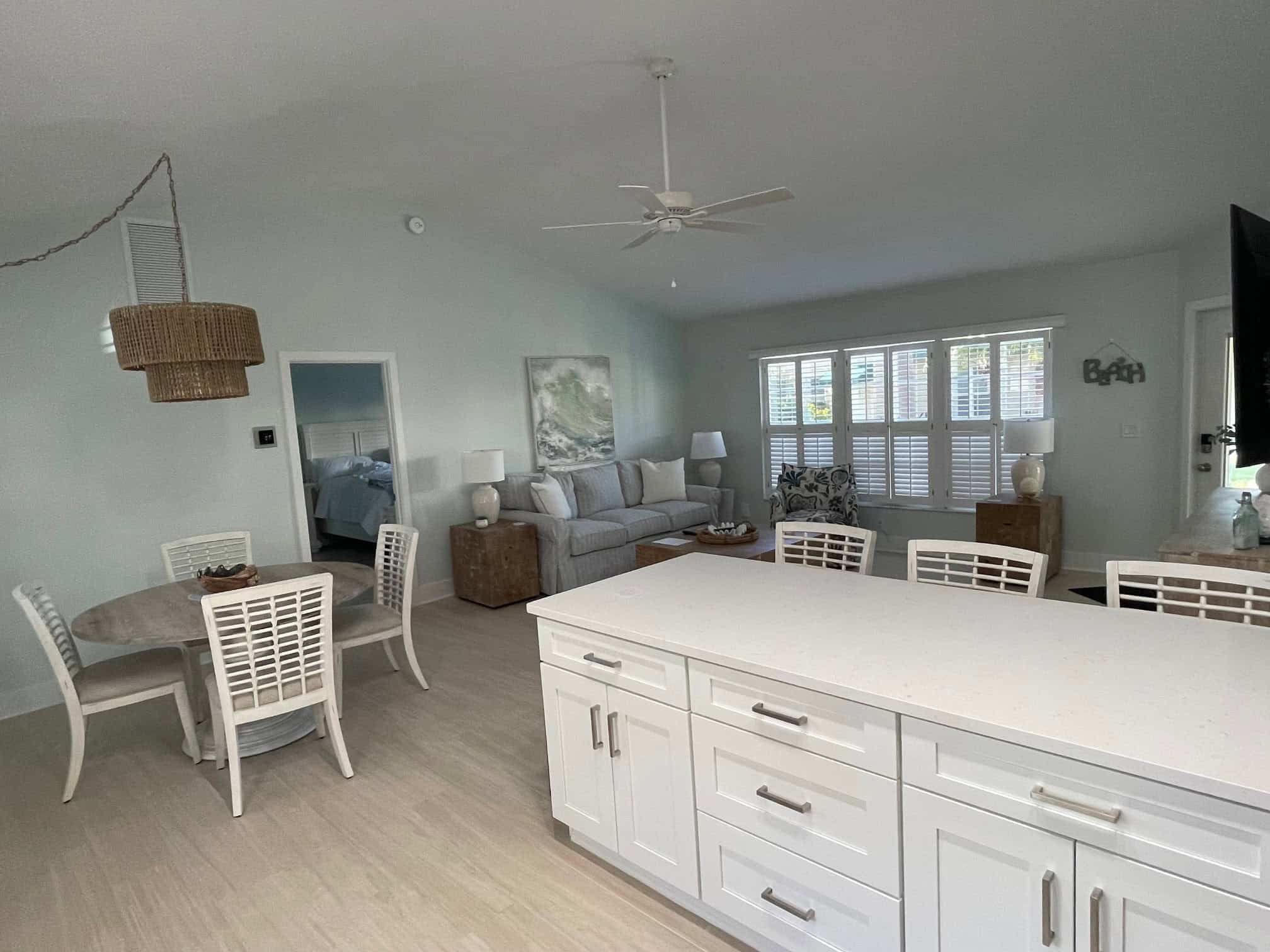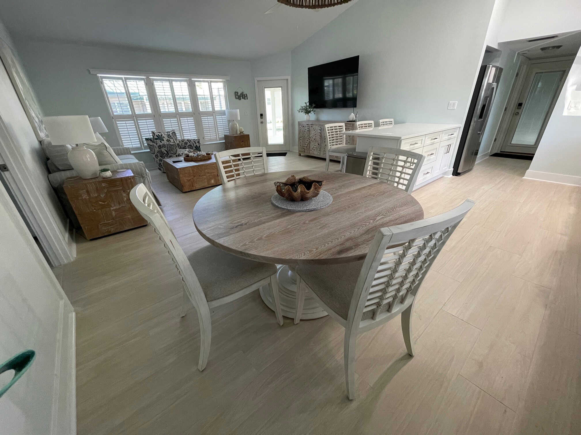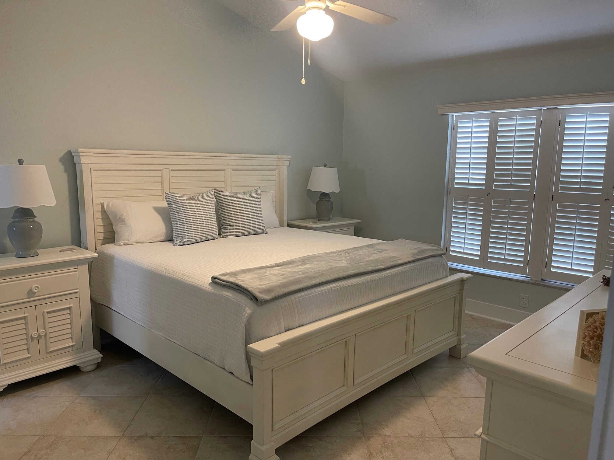 This updated, airy villa has 1121 sq. ft. of living space and sleeps 4. Cathedral ceilings and tile flooring; decorated in a sweet beach cottage style. Glass lanai overlooks tropical landscaped courtyard. Private garage. Steps from the powdery sands of the beach!